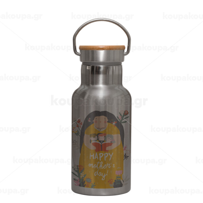Cute mother reading book, happy mothers day, Μεταλλικό παγούρι θερμός (Stainless steel) Ασημένιο με ξύλινο καπακι (bamboo), διπλού τοιχώματος, 350ml
