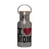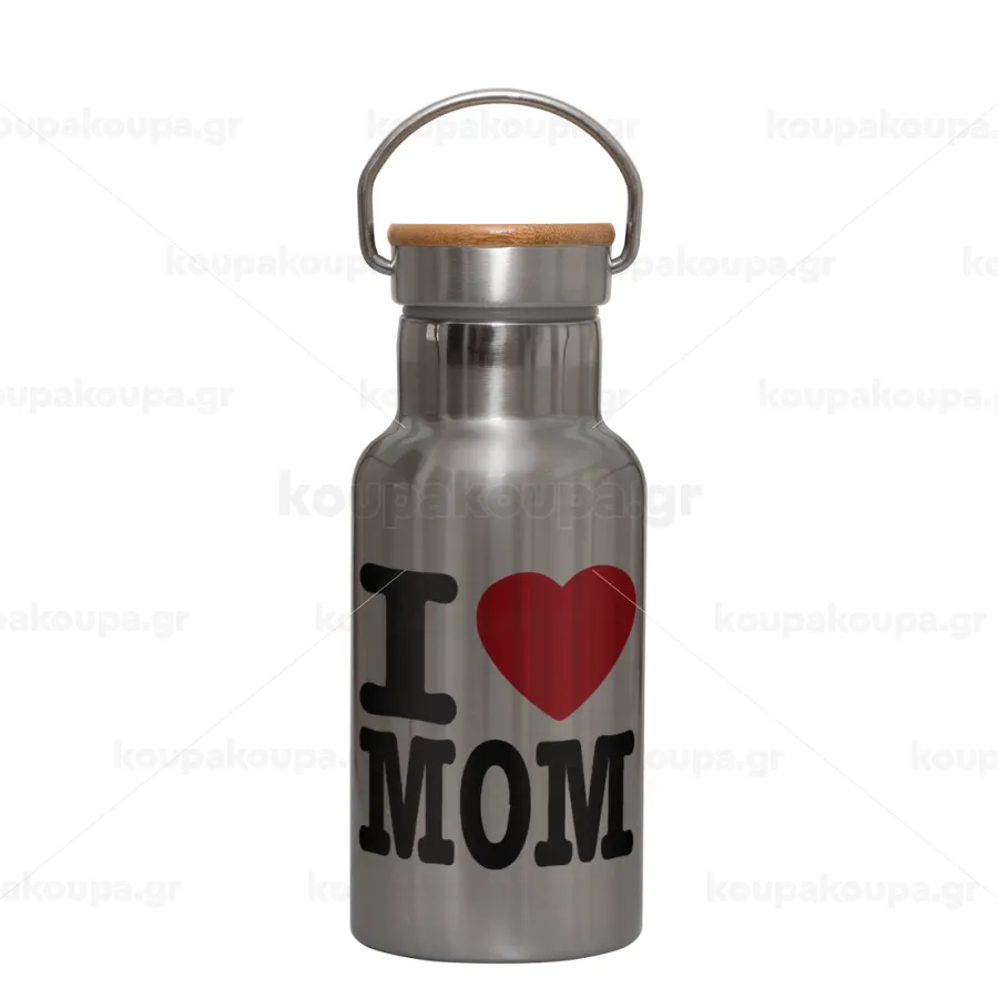 I LOVE MOM, Μεταλλικό παγούρι θερμός (Stainless steel) Ασημένιο με ξύλινο καπακι (bamboo), διπλού τοιχώματος, 350ml