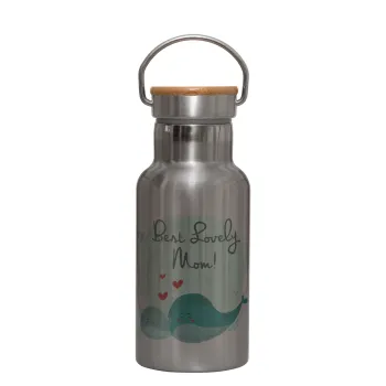 Mothers Day, whales, Μεταλλικό παγούρι θερμός (Stainless steel) Ασημένιο με ξύλινο καπακι (bamboo), διπλού τοιχώματος, 350ml