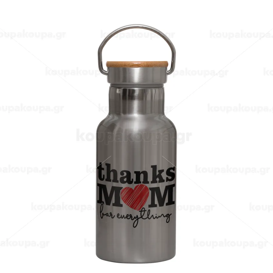 Thanks mom for everything, Μεταλλικό παγούρι θερμός (Stainless steel) Ασημένιο με ξύλινο καπακι (bamboo), διπλού τοιχώματος, 350ml