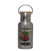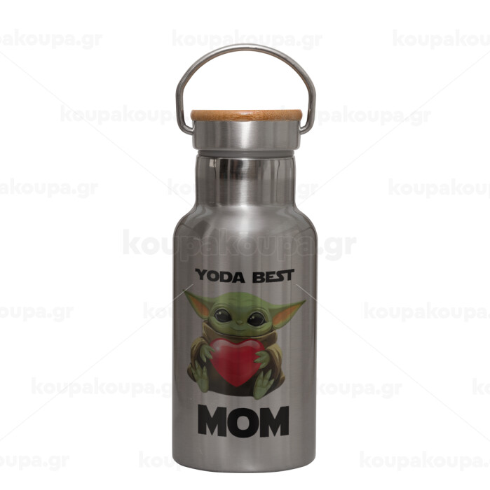 Yoda Best mom, Μεταλλικό παγούρι θερμός (Stainless steel) Ασημένιο με ξύλινο καπακι (bamboo), διπλού τοιχώματος, 350ml