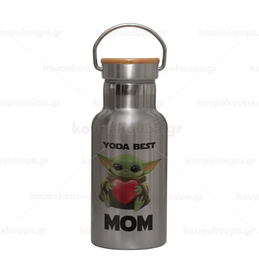 Yoda Best mom, Μεταλλικό παγούρι θερμός (Stainless steel) Ασημένιο με ξύλινο καπακι (bamboo), διπλού τοιχώματος, 350ml