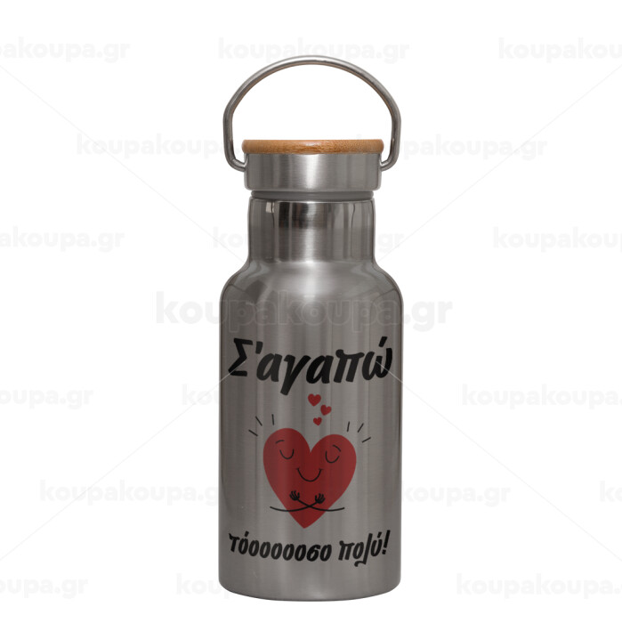 Σ΄αγαπώ τόοοοσο πολύ καρδιά, Μεταλλικό παγούρι θερμός (Stainless steel) Ασημένιο με ξύλινο καπακι (bamboo), διπλού τοιχώματος, 350ml