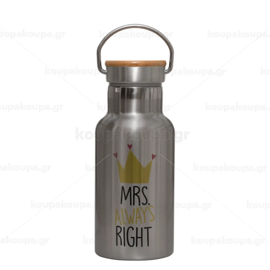 Mrs "Always" right, Μεταλλικό παγούρι θερμός (Stainless steel) Ασημένιο με ξύλινο καπακι (bamboo), διπλού τοιχώματος, 350ml