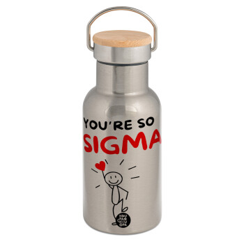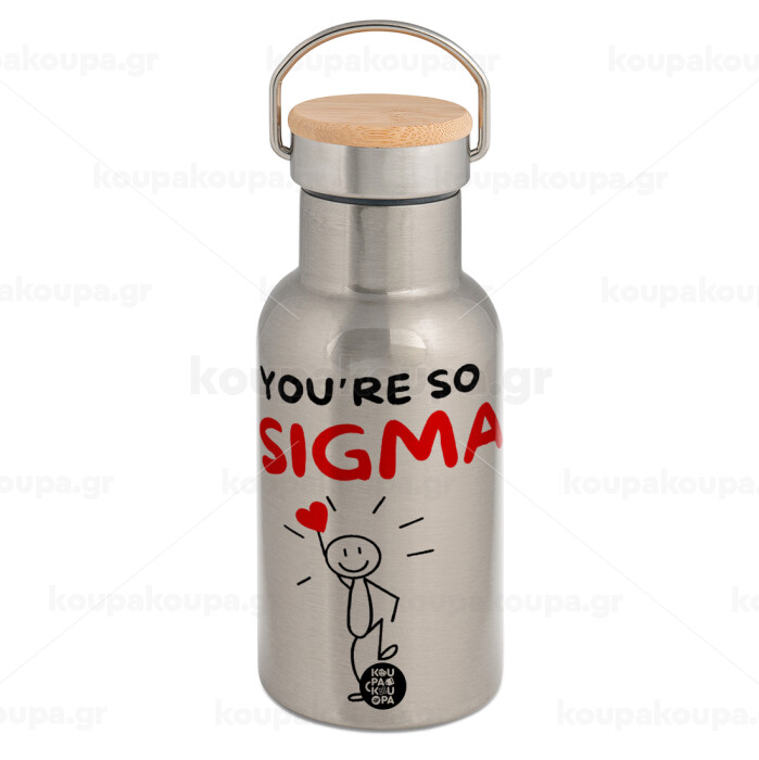 Sigma Valentine's Day , Μεταλλικό παγούρι θερμός (Stainless steel) Ασημένιο με ξύλινο καπακι (bamboo), διπλού τοιχώματος, 350ml
