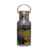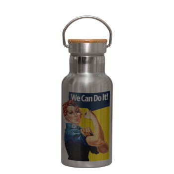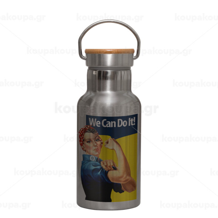 Rosie we can do it!, Μεταλλικό παγούρι θερμός (Stainless steel) Ασημένιο με ξύλινο καπακι (bamboo), διπλού τοιχώματος, 350ml
