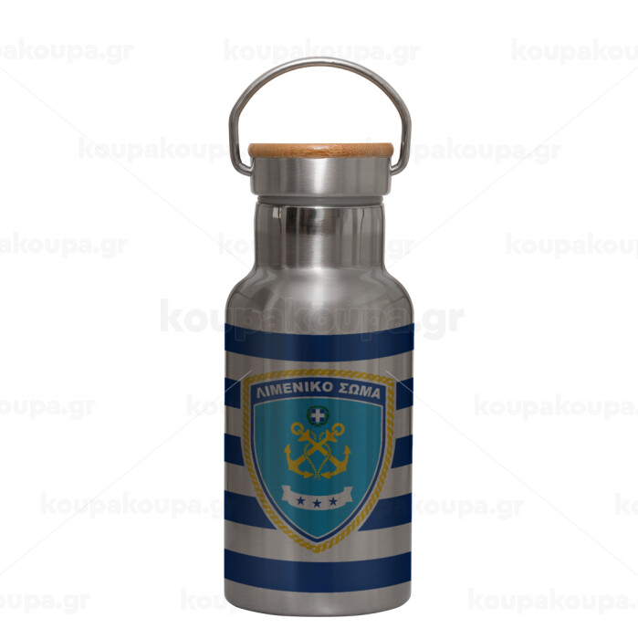 Λιμενικό σώμα, Μεταλλικό παγούρι θερμός (Stainless steel) Ασημένιο με ξύλινο καπακι (bamboo), διπλού τοιχώματος, 350ml