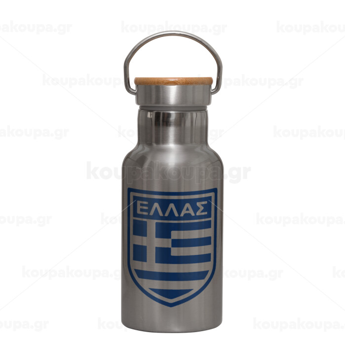 Ελλάς, Μεταλλικό παγούρι θερμός (Stainless steel) Ασημένιο με ξύλινο καπακι (bamboo), διπλού τοιχώματος, 350ml