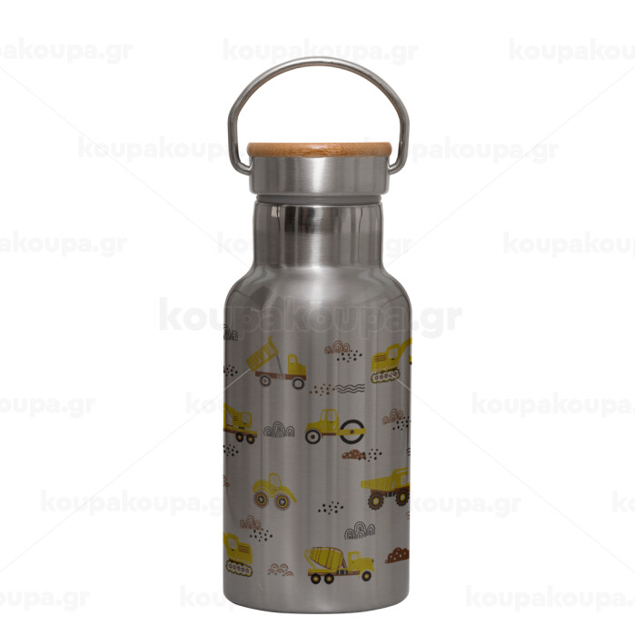 Αμαξάκια φορτωτές και μπουλντόζες, Μεταλλικό παγούρι θερμός (Stainless steel) Ασημένιο με ξύλινο καπακι (bamboo), διπλού τοιχώματος, 350ml