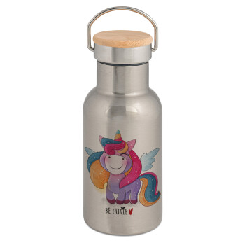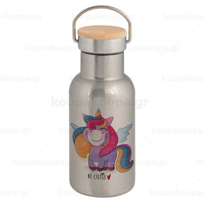 Μονόκερος, Μεταλλικό παγούρι θερμός (Stainless steel) Ασημένιο με ξύλινο καπακι (bamboo), διπλού τοιχώματος, 350ml