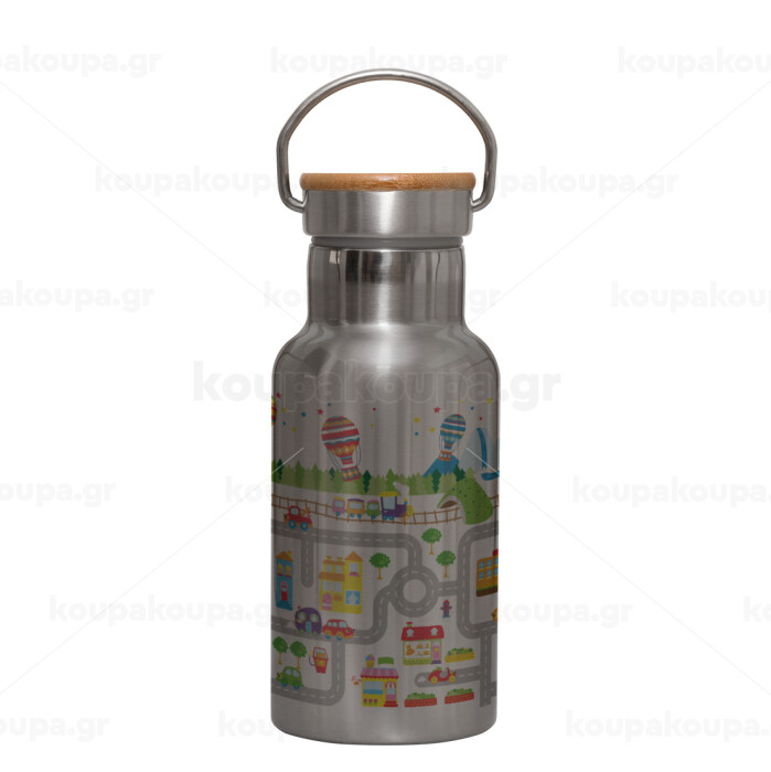City road track maps, Μεταλλικό παγούρι θερμός (Stainless steel) Ασημένιο με ξύλινο καπακι (bamboo), διπλού τοιχώματος, 350ml