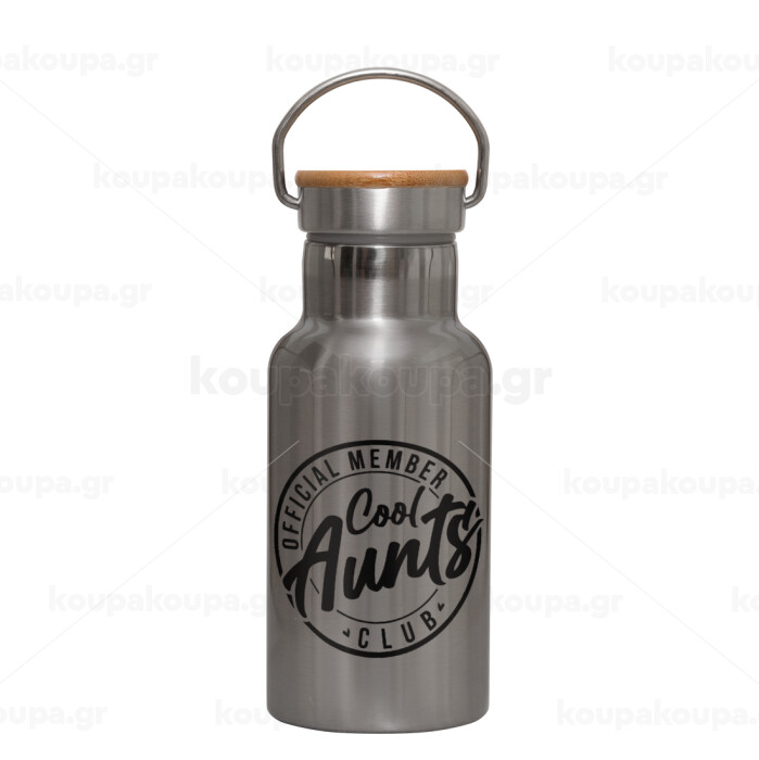 Cool Aunts club, Μεταλλικό παγούρι θερμός (Stainless steel) Ασημένιο με ξύλινο καπακι (bamboo), διπλού τοιχώματος, 350ml