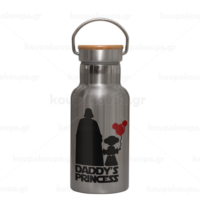 Daddy's princess, Μεταλλικό παγούρι θερμός (Stainless steel) Ασημένιο με ξύλινο καπακι (bamboo), διπλού τοιχώματος, 350ml
