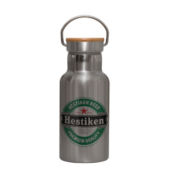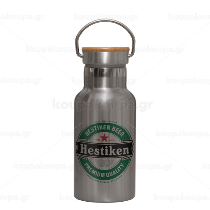 Hestiken Beer, Μεταλλικό παγούρι θερμός (Stainless steel) Ασημένιο με ξύλινο καπακι (bamboo), διπλού τοιχώματος, 350ml