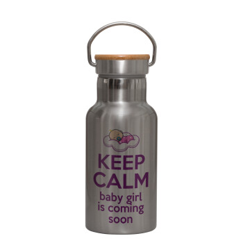 KEEP CALM baby girl is coming soon!!!, Μεταλλικό παγούρι θερμός (Stainless steel) Ασημένιο με ξύλινο καπακι (bamboo), διπλού τοιχώματος, 350ml