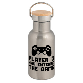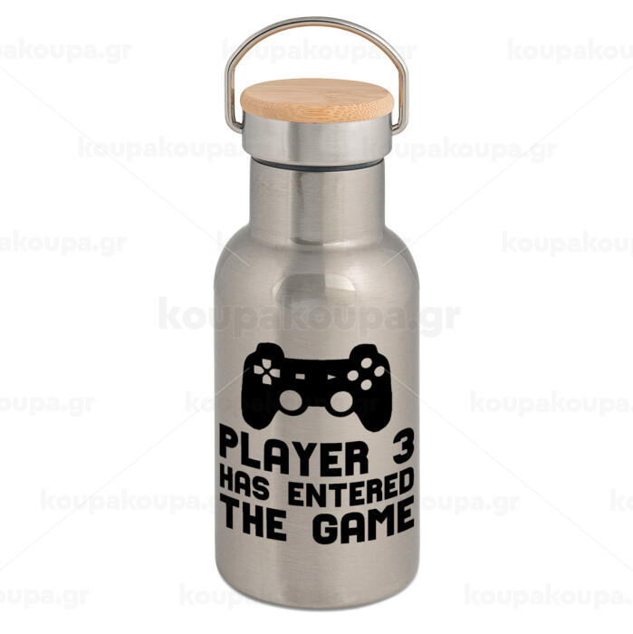 Player 3 has entered the Game, Μεταλλικό παγούρι θερμός (Stainless steel) Ασημένιο με ξύλινο καπακι (bamboo), διπλού τοιχώματος, 350ml