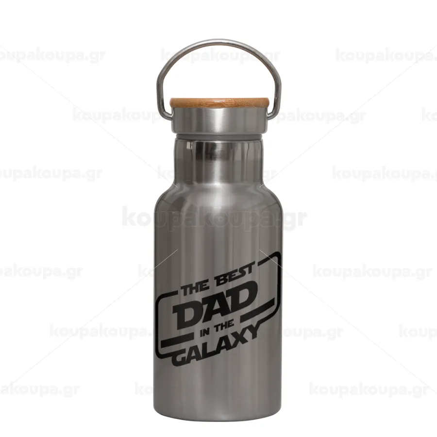 The Best DAD in the Galaxy, Μεταλλικό παγούρι θερμός (Stainless steel) Ασημένιο με ξύλινο καπακι (bamboo), διπλού τοιχώματος, 350ml