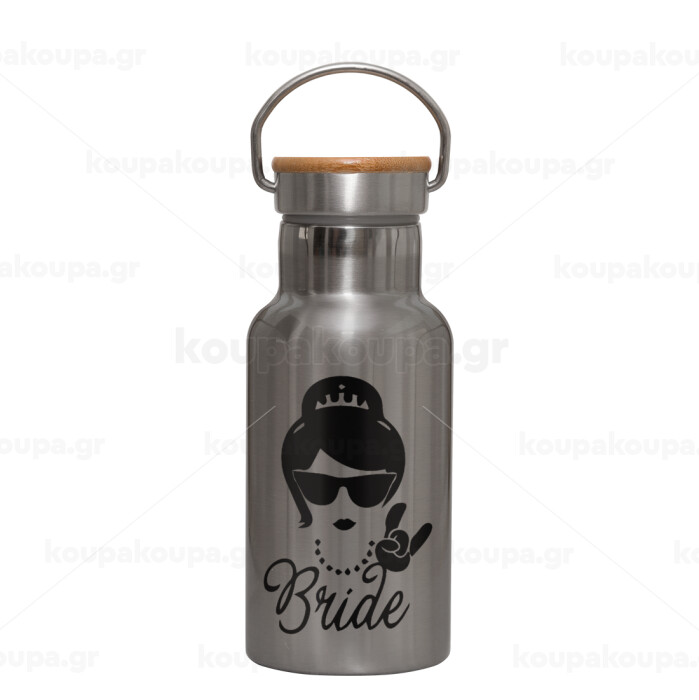 Bride hands, Μεταλλικό παγούρι θερμός (Stainless steel) Ασημένιο με ξύλινο καπακι (bamboo), διπλού τοιχώματος, 350ml