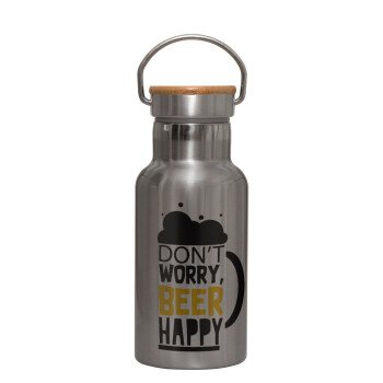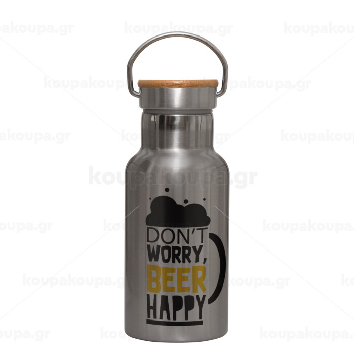 Don't worry BEER Happy, Μεταλλικό παγούρι θερμός (Stainless steel) Ασημένιο με ξύλινο καπακι (bamboo), διπλού τοιχώματος, 350ml