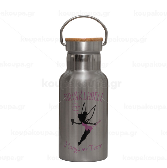 Drinkerbell bachellor, Μεταλλικό παγούρι θερμός (Stainless steel) Ασημένιο με ξύλινο καπακι (bamboo), διπλού τοιχώματος, 350ml