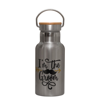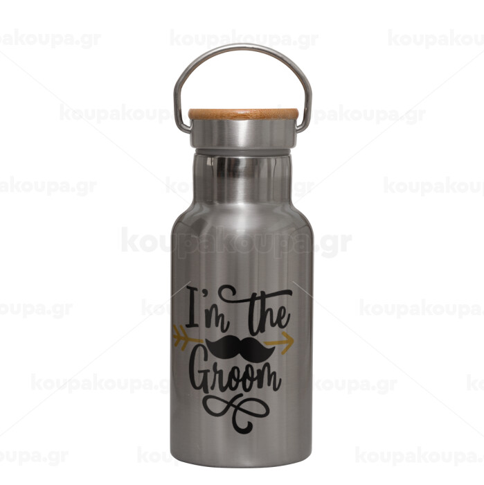 I'm the groom mustache, Μεταλλικό παγούρι θερμός (Stainless steel) Ασημένιο με ξύλινο καπακι (bamboo), διπλού τοιχώματος, 350ml