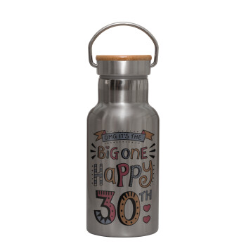 Big one Happy 30th, Μεταλλικό παγούρι θερμός (Stainless steel) Ασημένιο με ξύλινο καπακι (bamboo), διπλού τοιχώματος, 350ml