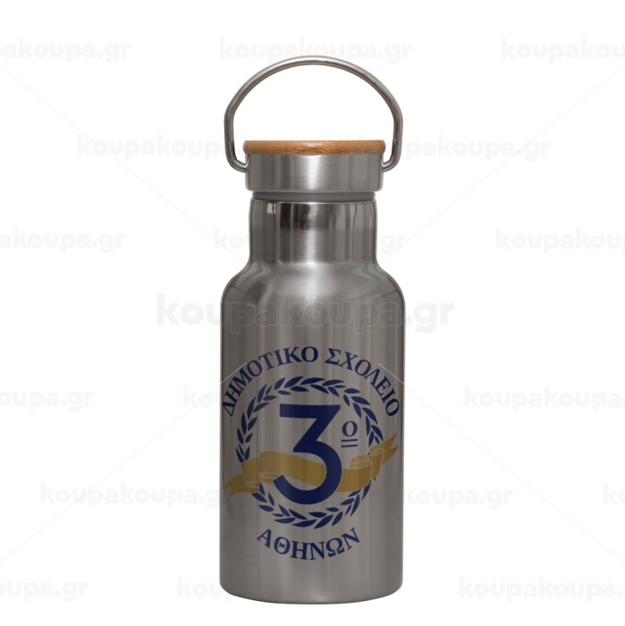 Έμβλημα Σχολικό μπλε, Μεταλλικό παγούρι θερμός (Stainless steel) Ασημένιο με ξύλινο καπακι (bamboo), διπλού τοιχώματος, 350ml