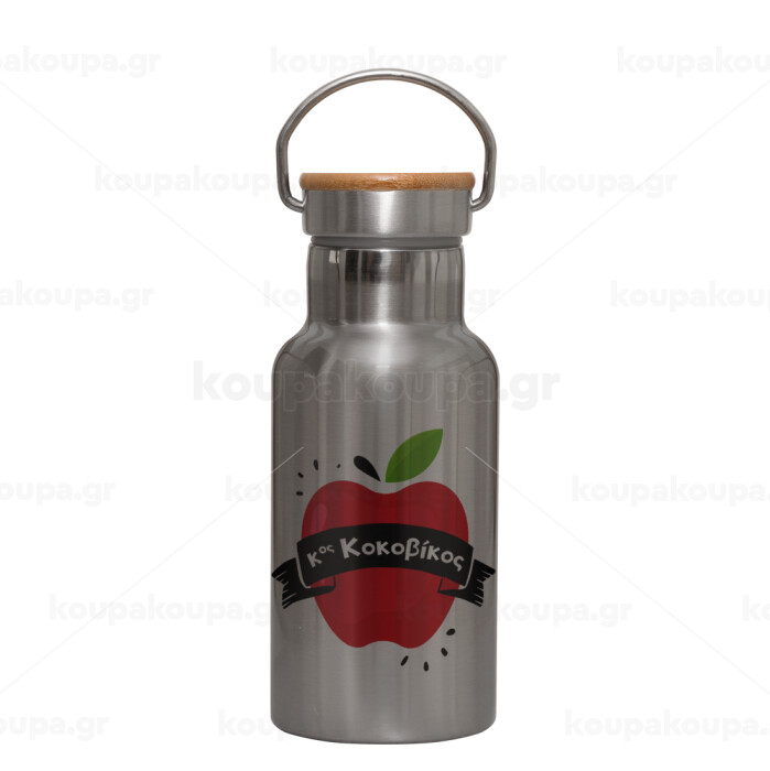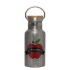 Αναμνηστικό Δώρο Δασκάλου Κόκκινο Μήλο, Μεταλλικό παγούρι θερμός (Stainless steel) Ασημένιο με ξύλινο καπακι (bamboo), διπλού τοιχώματος, 350ml