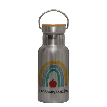 Η καλύτερη δασκάλα, Μεταλλικό παγούρι θερμός (Stainless steel) Ασημένιο με ξύλινο καπακι (bamboo), διπλού τοιχώματος, 350ml