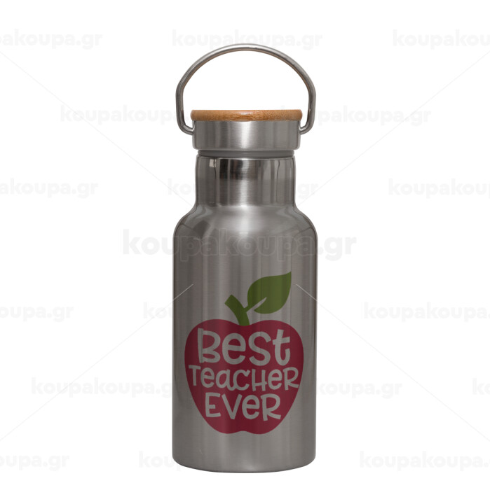 best teacher ever, apple!, Μεταλλικό παγούρι θερμός (Stainless steel) Ασημένιο με ξύλινο καπακι (bamboo), διπλού τοιχώματος, 350ml