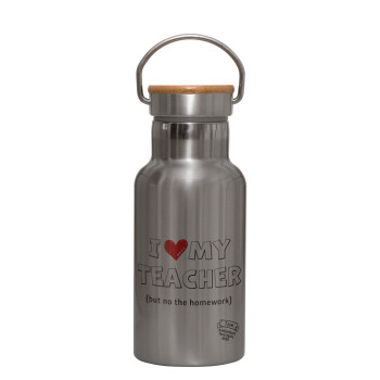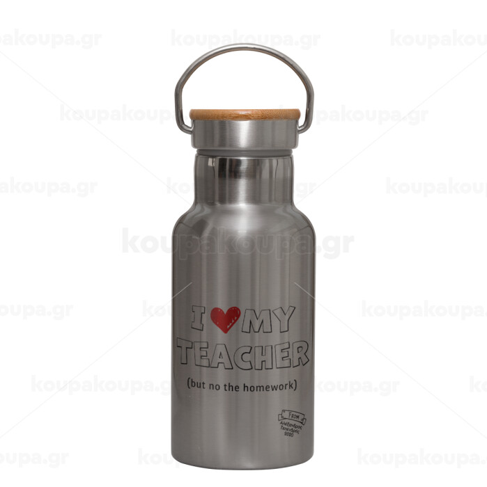 i love my teacher but no the homework outline, Μεταλλικό παγούρι θερμός (Stainless steel) Ασημένιο με ξύλινο καπακι (bamboo), διπλού τοιχώματος, 350ml