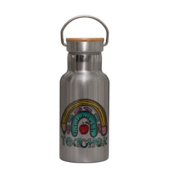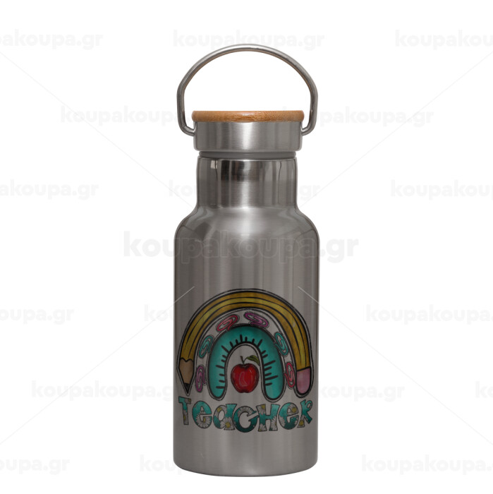 Teacher, Μεταλλικό παγούρι θερμός (Stainless steel) Ασημένιο με ξύλινο καπακι (bamboo), διπλού τοιχώματος, 350ml