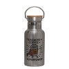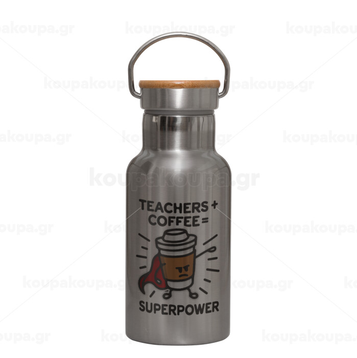 Teacher Coffee Super Power, Μεταλλικό παγούρι θερμός (Stainless steel) Ασημένιο με ξύλινο καπακι (bamboo), διπλού τοιχώματος, 350ml
