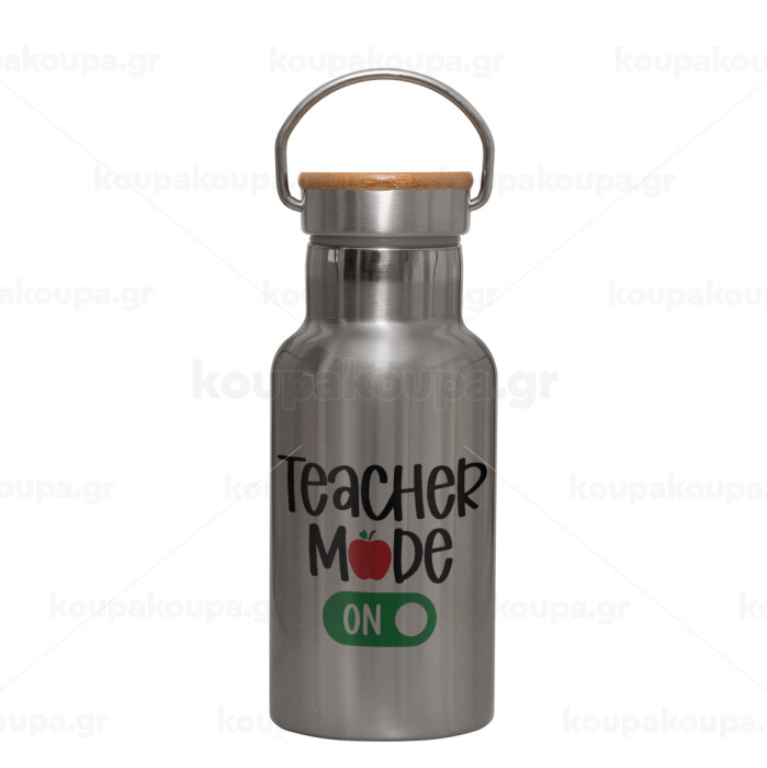 Teacher mode ON, Μεταλλικό παγούρι θερμός (Stainless steel) Ασημένιο με ξύλινο καπακι (bamboo), διπλού τοιχώματος, 350ml