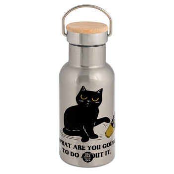 CAT, what are you going to do about it!, Μεταλλικό παγούρι θερμός (Stainless steel) Ασημένιο με ξύλινο καπακι (bamboo), διπλού τοιχώματος, 350ml