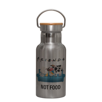 friends, not food, Μεταλλικό παγούρι θερμός (Stainless steel) Ασημένιο με ξύλινο καπακι (bamboo), διπλού τοιχώματος, 350ml