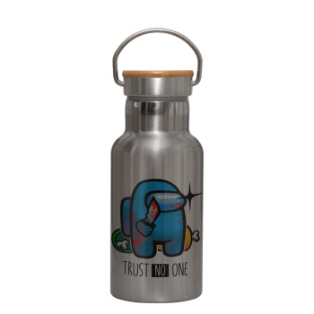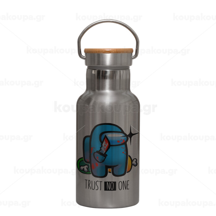 Among Trust no one, Μεταλλικό παγούρι θερμός (Stainless steel) Ασημένιο με ξύλινο καπακι (bamboo), διπλού τοιχώματος, 350ml