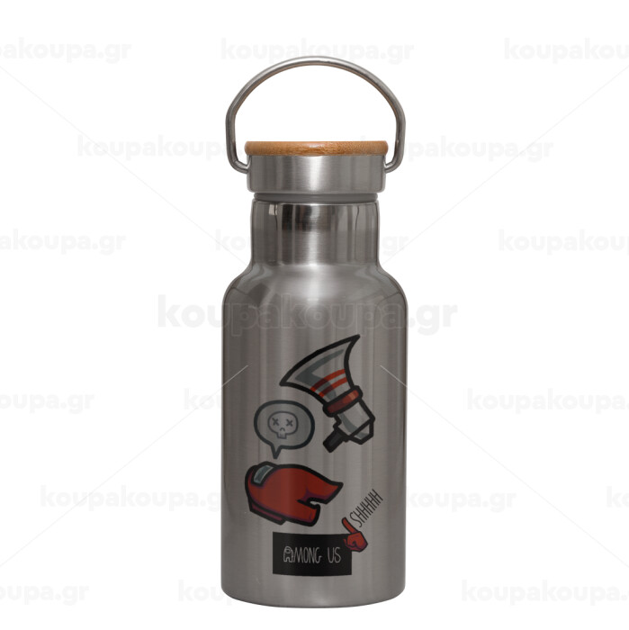 Among US Shhhh!!!, Μεταλλικό παγούρι θερμός (Stainless steel) Ασημένιο με ξύλινο καπακι (bamboo), διπλού τοιχώματος, 350ml
