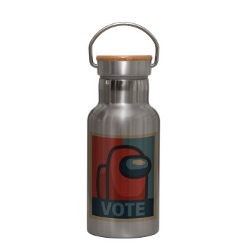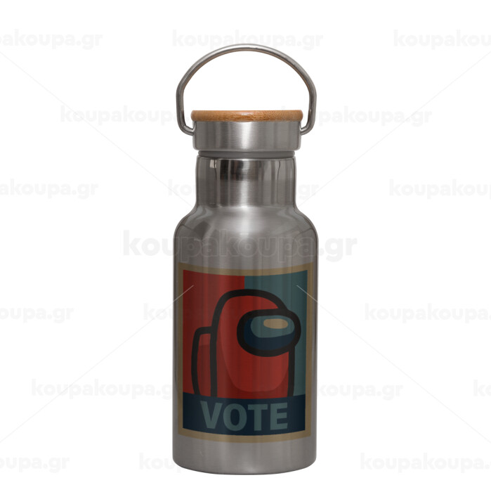Among US VOTE, Μεταλλικό παγούρι θερμός (Stainless steel) Ασημένιο με ξύλινο καπακι (bamboo), διπλού τοιχώματος, 350ml