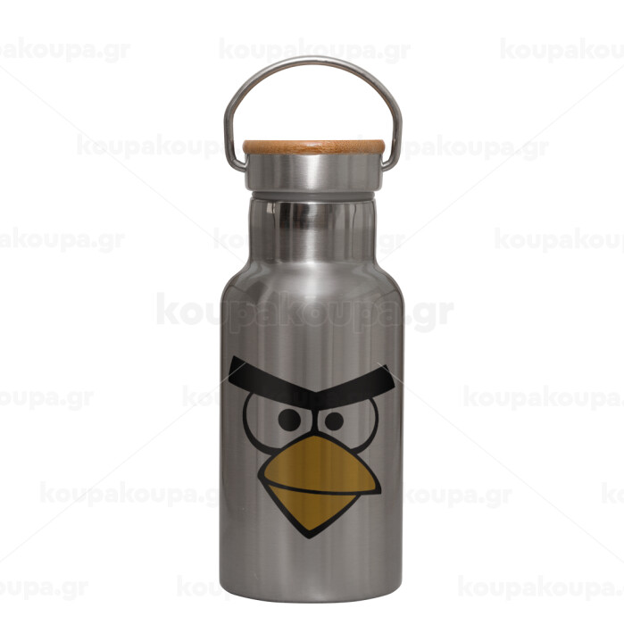 Angry birds eyes, Μεταλλικό παγούρι θερμός (Stainless steel) Ασημένιο με ξύλινο καπακι (bamboo), διπλού τοιχώματος, 350ml