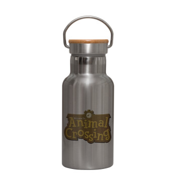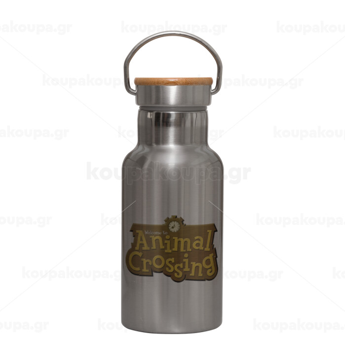 Animal Crossing, Μεταλλικό παγούρι θερμός (Stainless steel) Ασημένιο με ξύλινο καπακι (bamboo), διπλού τοιχώματος, 350ml