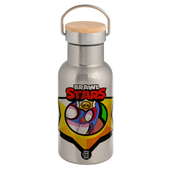 Brawl Stars El primo, Μεταλλικό παγούρι θερμός (Stainless steel) Ασημένιο με ξύλινο καπακι (bamboo), διπλού τοιχώματος, 350ml