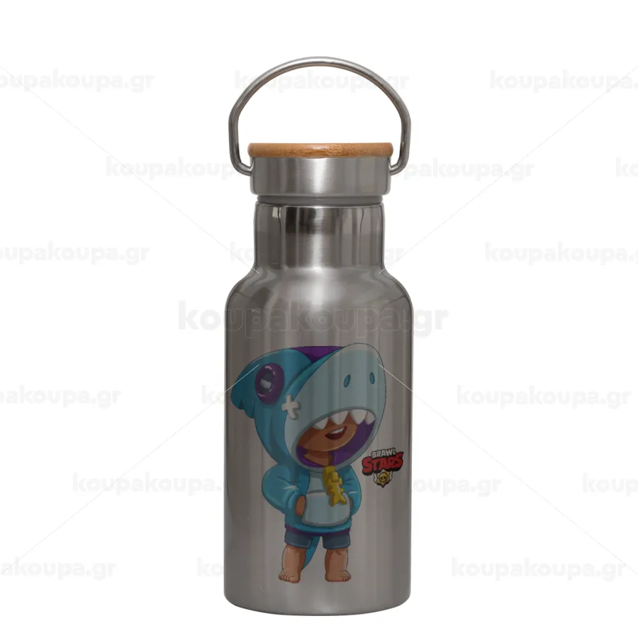 Brawl Stars Leon Shark, Μεταλλικό παγούρι θερμός (Stainless steel) Ασημένιο με ξύλινο καπακι (bamboo), διπλού τοιχώματος, 350ml