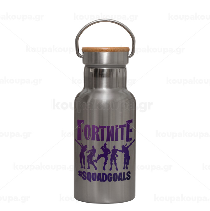 Fortnite #squadgoals, Μεταλλικό παγούρι θερμός (Stainless steel) Ασημένιο με ξύλινο καπακι (bamboo), διπλού τοιχώματος, 350ml