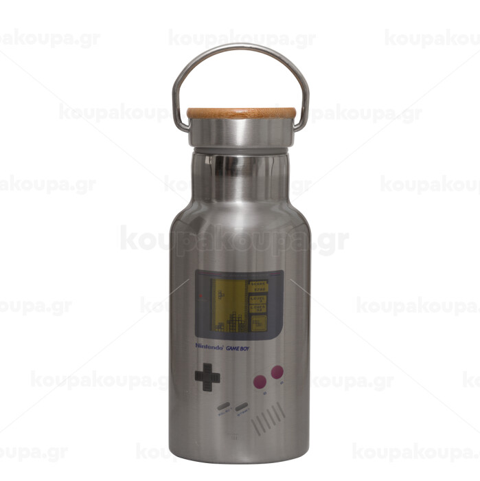 Gameboy, Μεταλλικό παγούρι θερμός (Stainless steel) Ασημένιο με ξύλινο καπακι (bamboo), διπλού τοιχώματος, 350ml