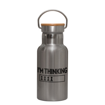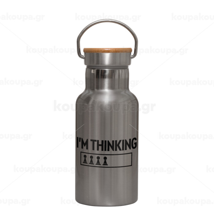 I'm thinking, Μεταλλικό παγούρι θερμός (Stainless steel) Ασημένιο με ξύλινο καπακι (bamboo), διπλού τοιχώματος, 350ml