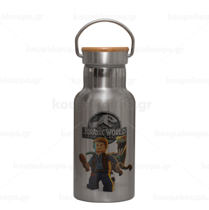 Jurassic world, Μεταλλικό παγούρι θερμός (Stainless steel) Ασημένιο με ξύλινο καπακι (bamboo), διπλού τοιχώματος, 350ml