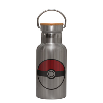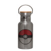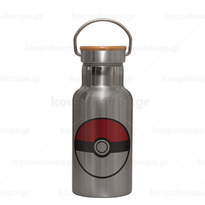 Pokemon ball, Μεταλλικό παγούρι θερμός (Stainless steel) Ασημένιο με ξύλινο καπακι (bamboo), διπλού τοιχώματος, 350ml