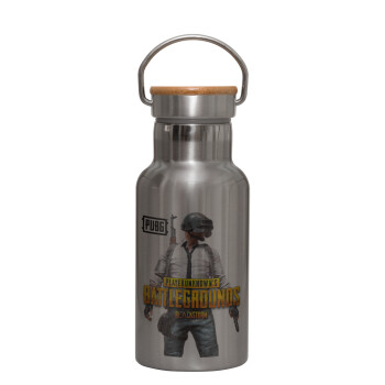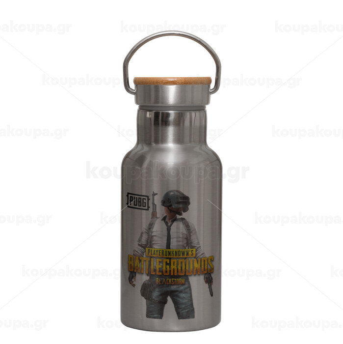 PUBG battleground royale, Μεταλλικό παγούρι θερμός (Stainless steel) Ασημένιο με ξύλινο καπακι (bamboo), διπλού τοιχώματος, 350ml