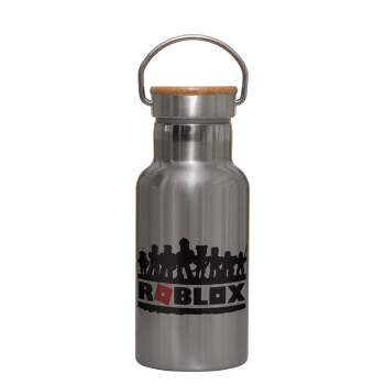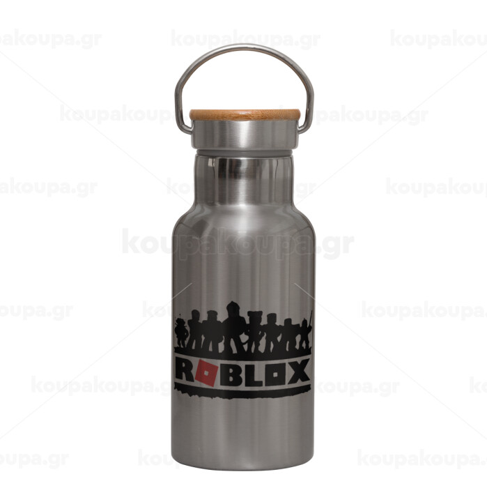 Roblox team, Μεταλλικό παγούρι θερμός (Stainless steel) Ασημένιο με ξύλινο καπακι (bamboo), διπλού τοιχώματος, 350ml